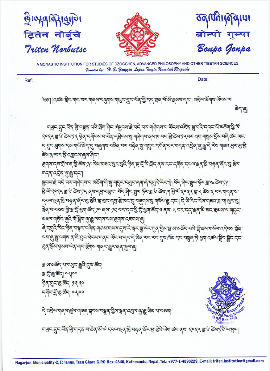 གཡུང་དྲུང་བོན་གྱི་གདན་ས་ཆེན་མོ་༧ དཔལ་ལྡན་ཁྲི་བརྟན་ནོར་བུ་རྩེའི་ཡིག་ཚང་ནས་ ༢༠༢༥ ཟླ་༦ ཚེས་༡༦ ལ་ཕུལ།