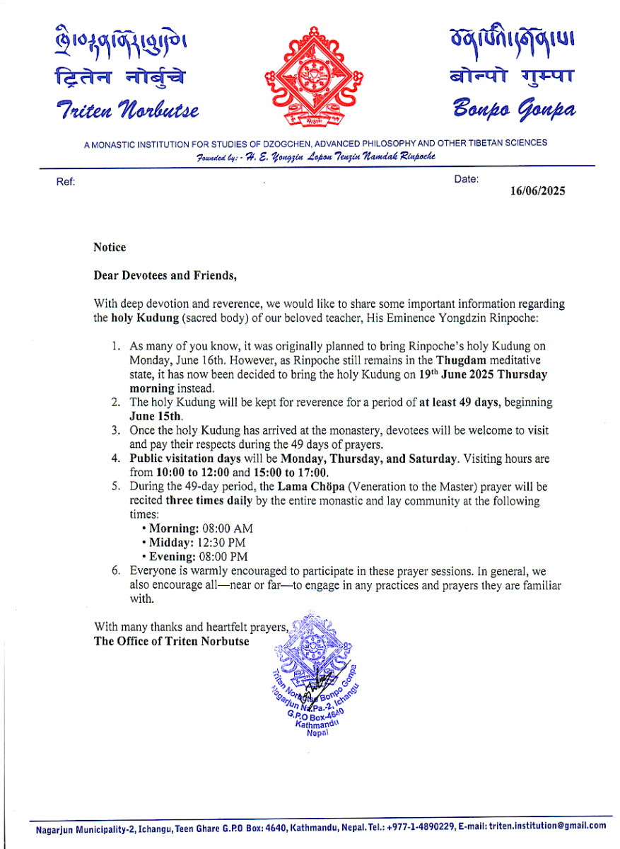 གཡུང་དྲུང་བོན་གྱི་བསྟན་པའི་སྲོག་ཤིང་༧སྐྱབས་རྗེ་བདེ་བར་གཤེགས་པ་ཡོངས་འཛིན་སྨྲ་བའི་དབང་པོ་མཆོག་ཕྱི་ལོ་༢༠༢༥ ཟླ་༦ ཚེས་༡༢ ཉིན་དགོངས་པ་བོན་དབྱིངས་སུ་གཤེགས་ནས་ཁ་སང་ཕྱི་ཚེས་༡༥བར་ཞག་གསུམ་དྲོས་བཞི་ཚང་ཡང་ད་དུང་ཐུགས་དམ་གཡོ་མེད་དུ་བཞུགས་བཞིན་པར་བརྟེན་སྐུ་གདུང་དགོན་པར་གདན་འདྲེན་ཞུ་རྒྱུ་དེ་རེས་གཟའ་ཕུར་བུ་ཕྱི་ཚེས་༡༩བར་ཕྱི་འགྱངས་ཞུས་ཤིང་།
