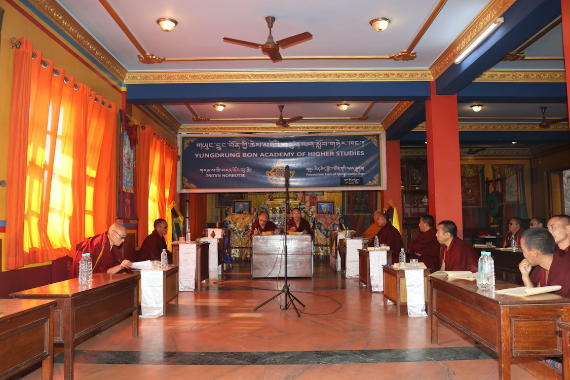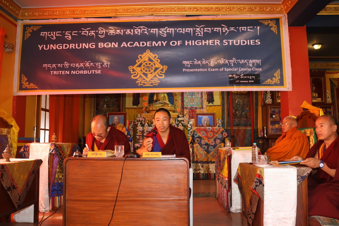 གཡུང་དྲུང་བོན་གྱི་ཆེས་མཐོའི་གཙུག་ལག་སློབ་གཉེར་ཁང་གི་སྐབས་སོ་གཅིག་པའི་བཤད་སྒྲུབ་འདུས་སྡེས་གོ་སྒྲིག་འོག ཕྱི་ལོ་༢༠༢༦ ལོའི་ཟླ་བ་༡ པོའི་ཚེས་༡༧ ཉིན་གྱི་ཞོགས་པ་ཕྱག་ཚོད་༨ སྐར་མ་༣༠ པའི་ཐོག་རྒྱུགས་སྤྲོད་ཁང་དུ་གྲྭ་མང་རྣམས་འཛོམས་ཐོག ༧སྐྱབས་རྗེ་སློབ་དཔོན་ཚངས་པ་བསྟན་འཛིན་རིན་པོ་ཆེ་མཆོག བཤད་སྒྲུབ་དཔོན་སློབ་དགེ་བཤེས་བློ་གྲོས་གཙུག་ཕུད་མཆོག་དང་། དེ་བཞིན་དགེ་རྒན་ལྷན་ཚོགས་དང་། དགེ་བའི་བཤེས་གཉེན་རྣམ་པ་བཅས་རྒྱུགས་དཔང་དུ་ཕེབས་ཤིང་། ཐོག་མར་ཐེངས་འདིའི་བཤད་རྒྱུགས་ཀྱི་གཙོ་སྐྱོང་བ་རྩ་འཛིན་སློབ་དཔོན་དགེ་བཤེས་མཁྱེན་རབ་རྒྱ་མཚོ་ལགས་ནས། ཆེད་སྦྱོང་ངམ་རིགས་གཅིག་རྐང་འཛིན་གྱི་ལམ་སྲོལ་དང་དགོས་དམིགས་སྐོར་ངོ་སྤྲོད་གནང་། དེ་ནས་རྒྱུགས་སྤྲོད་ཀྱི་དོ་དམ་པས་སྟངས་འཛིན་འོག་རྒྱུགས་སྤྲོད་ཀྱི་བརྗོད་གཞི་རྒྱན་ཤོག་འཐེན་ཏེ་ཐོག་མར་མ་རྒྱུད་ཆེད་སྦྱོང་སློབ་གཉེར་བ་བདེ་ཆེན་དཔལ་ལྡན་ལགས་ནས། ལམ་རྒྱུད་ལས། དགོངས་པའི་ཐིག་ལེ་ཡེ་ཤེས་མི་གཡོ་གསལ། མོས་འདུན་བླ་མ་ཐིག་ལེའི་མཁའ་འགྲོ་མ། མི་གཡོ་ལམ་རྟགས་གསལ་བའི་དོན་དང་ལྔ། ཞེས་པ་སོགས་ལ་དཔྱད་ནས་དགོངས་སྤྱོད་རྣམ་གསུམ་སྐོར་ལ་འཆད་རྒྱུ། ཞེས་པའི་ཁ་བྱང་ཐོག་ནས་ཆུ་ཚོད་ཕྱེད་ཀའི་རིང་བགྲོ་གླེང་གནང་རྗེས། སྐར་མ་༡༥ རིང་ལ་དྲི་བ་དྲིས་ལན་གནང་བ་དང་།