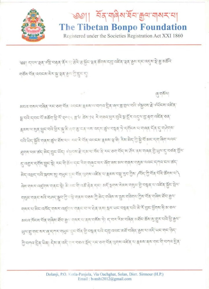 སླར་ཡང་བསྟན་པའི་མེ་རོ་བྱང་ཕྱོགས་ཧི་མ་ཅལ་མངའ་ཁོངས་བོན་གཞིས་ཐོབ་རྒྱལ་གསར་པ་ནས་གསོས་ཏེ། ད་བར་རིམ་བཞིན་མཐོང་ཆོས་སུ་གྱུར་པའི་ཕྱི་རྒྱལ་ཡུལ་གྲུ་གང་སར་ཞྭ་དཀར་གཡུང་དྲུང་བོན་གྱི་བསྟན་པའི་དབུ་འཕང་མཐོ་བཞིན་རྒྱས་པ་འདི་ཡང་གང་ཉིད་ཀྱི་བཀའ་དྲིན་ཡིན། དེས་ན་འདི་གར་བཅའ་སྡོད་རང་ཅག་བོན་ལུགས་འཛིན་པ་རྣམས་ནས་གང་གི་བཀའ་དྲིན་སྙིང་དུ་བཅངས་པའི་ཐོག་ནས་དགུང་ཞག་ཞེ་དགུའི་རིང་སྡིག་སྤང་དགེ་སྒྲུབ་ཀྱི་ལས་བཟང་དང་། མཆོད་འབུལ་སྨོན་ལམ་གང་ཐུབ་ཞུས་དང་ཞུ་བཞིན་པ་དང་། སླད་ཀྱང་དམ་པ་ཁོང་གི་ཞལ་གདམས་ལྟར་རྗེས་འཇུག་བོན་འབངས་ཡོངས་ནས་བཀའ་བཞིན་སྒྲུབ་རྒྱུའི་རེ་སྨོན་ཞུ་རྒྱུ་བཅས།